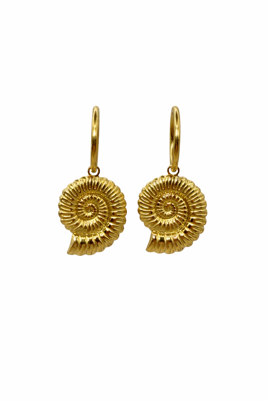 De oorbellen zijn uitgevoerd in een gedetailleerde ammonietvorm met subtiele reliëfs die het licht prachtig vangen.